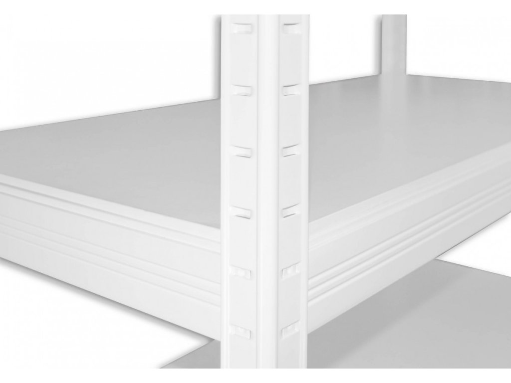 Abstellraum Regal mit Laminatböden - weiss beschichtet. Besteht aus einer Metallkonstruktion im Stecksystem. Die Laminatböden ist 12 mm und an allen 4 Seiten geklebt. Die Laminatplatte kann mit feuchten Tuch abgewischt werden und dann noch mit einem trockenen Tuch austrocknen. Die montage dauert cca 15 - 30 Minuten, dank des schraubloser Stecksystems. Die Fachböden können variabel eingesetzt werden. Die erste Fach sollte nicht höher als im 40 cm sein. Dieses Abstellraum Regal ist ideal für den Lager, den Keller, Werkstätte oder Garage
