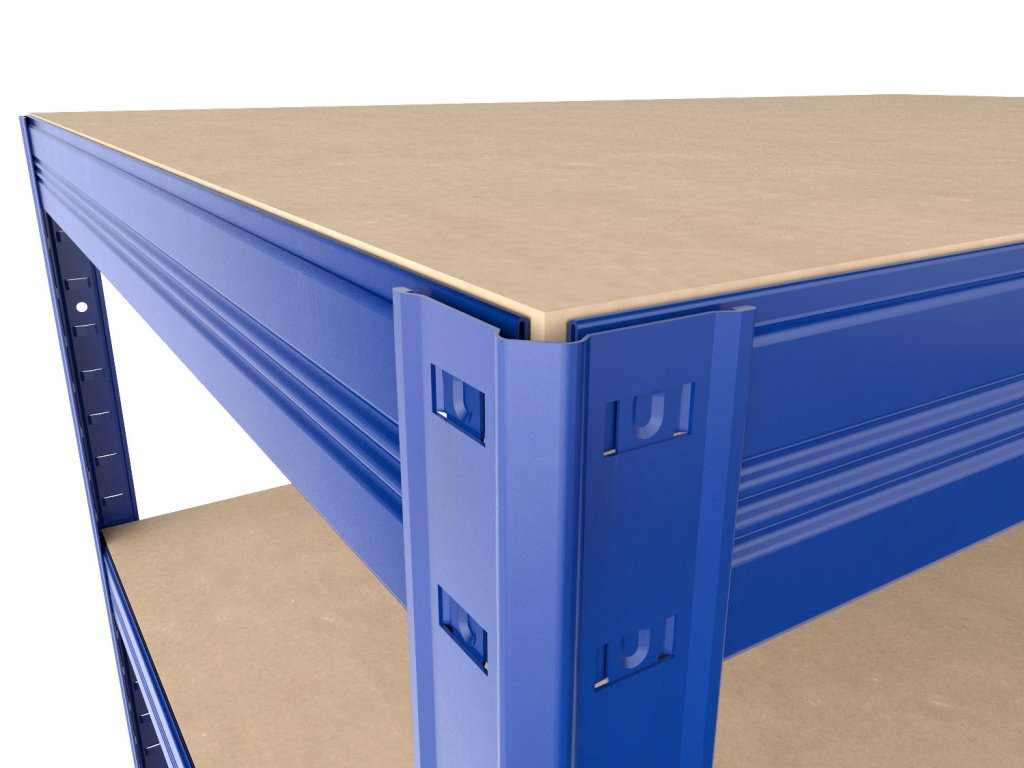 Garagenregal mit Fachböden aus MDF-Platten, die unter hohem Druck hergestellt werden. Es zeichnet sich durch hohe Stabilität und ein intuitives Stecksystem aus. Die werkzeuglose Montage ist schnell und unkompliziert: Die Bodenträger werden einfach in die Winkelprofile gesteckt und durch leichtes Klopfen fixiert. Diese schraubenlose Verbindung garantiert eine hohe Steifigkeit. Wichtiger Hinweis: Die MDF-Platten sind nur für trockene Innenräume geeignet.