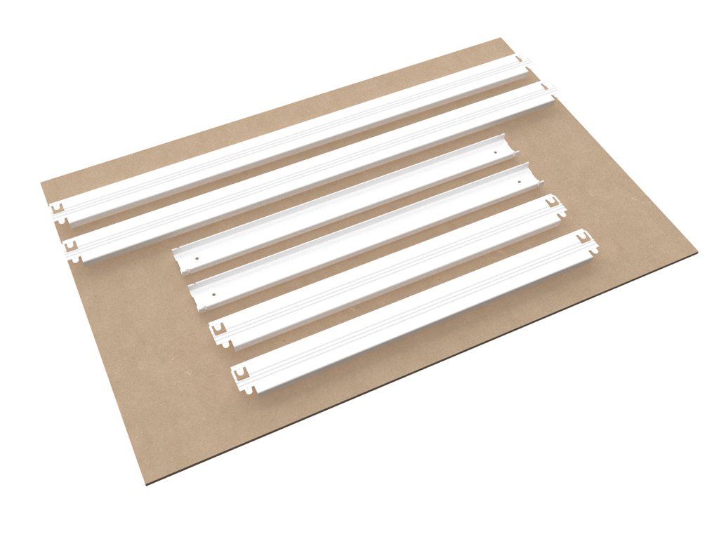 Die Packet enthält: 2 kurze Bodenträger, 2 lange Bodenträger, Holzspannplatte MDF 6 mm, 2 Versteifungen