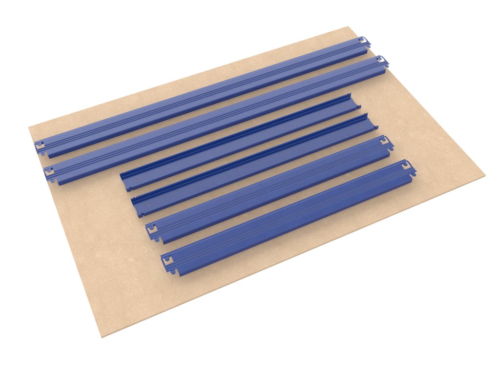 Die Packet enthält: 2 kurze Bodenträger, 2 lange Bodenträger, Holzspannplatte MDF 6 mm, 2 Versteifungen