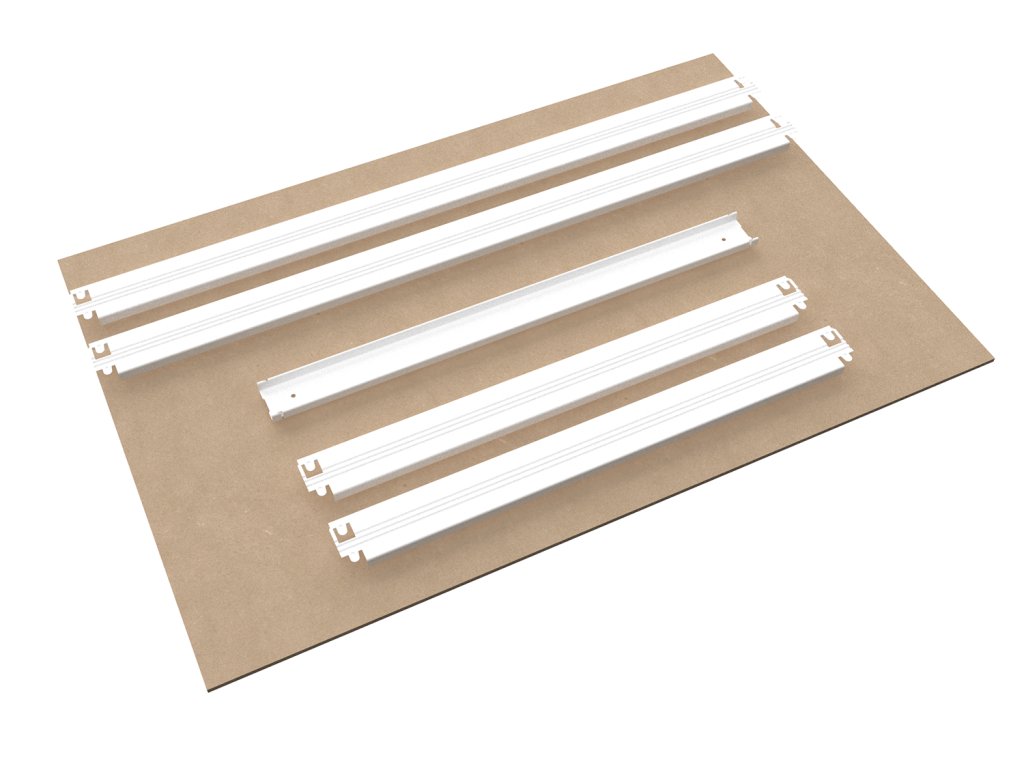 Die Packet enthält: 2 kurze Bodenträger, 2 lange Bodenträger, Holzspannplatte MDF 6 mm, 1 Versteifung