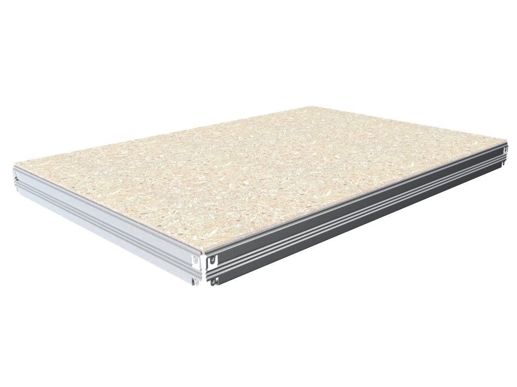 Zusätzlicher Fachboden aus OSB-Spanplatte 10 mm zur Erweiterung des Biedrax-Regalsystems. Das Paket enthält einen Fachboden und einen kompletten Satz Träger und Versteifungen. Ideal zur Kapazitätserweiterung in feuchten und trockenen Umgebungen.