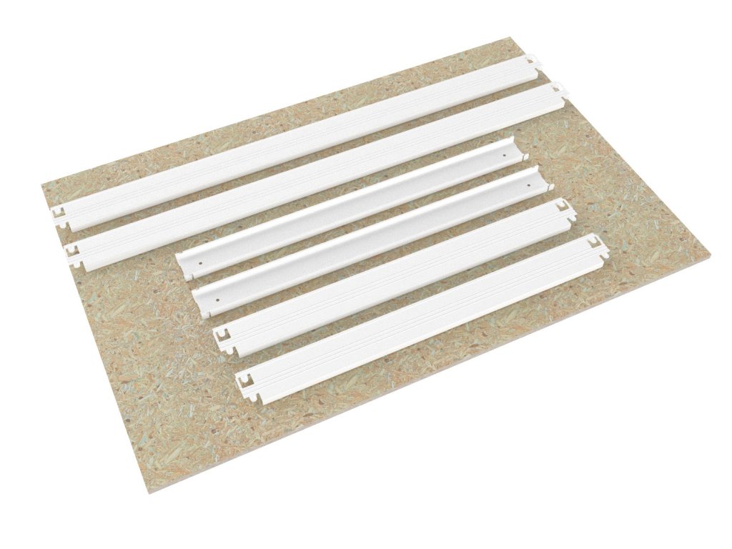 - Lieferumfang: ein kompletter Fachboden, wie auf dem ersten Bild oben in der Galerie dargestellt: Trägersatz, Versteifungen und OSB-Spanplatte 10 mm. Alles Nötige für die Montage eines Bodens.