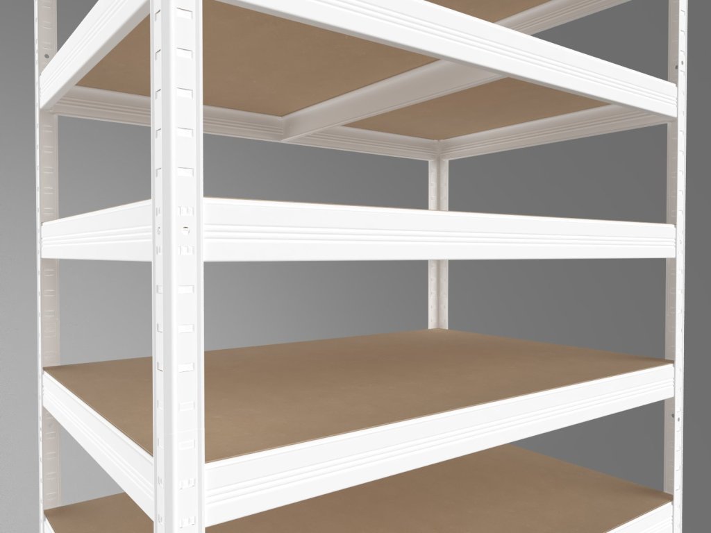 Lagerregal mit Fachböden aus MDF-Platten, die unter hohem Druck hergestellt werden. Es zeichnet sich durch hohe Stabilität und ein intuitives Stecksystem aus. Die werkzeuglose Montage ist schnell und unkompliziert: Die Bodenträger werden einfach in die Winkelprofile gesteckt und durch leichtes Klopfen fixiert. Diese schraubenlose Verbindung garantiert eine hohe Steifigkeit. Wichtiger Hinweis: Die MDF-Platten sind nur für trockene Innenräume geeignet.