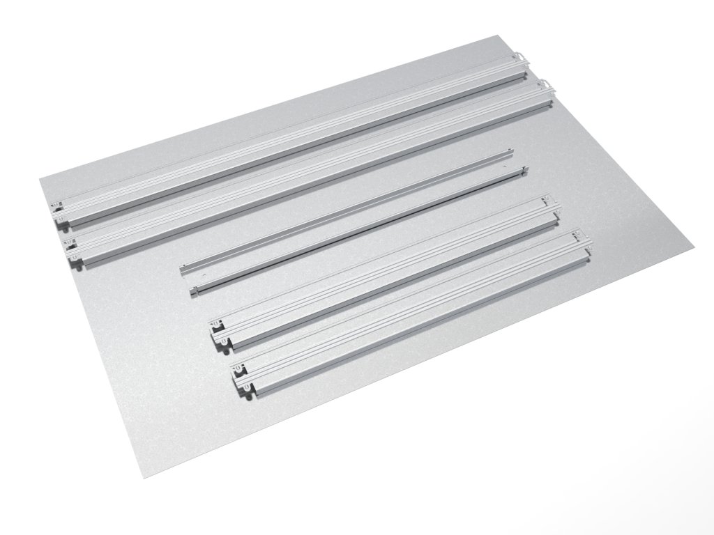 - Die Versteifung wird in die Träger eingeschoben, bevor diese in die Winkelprofile eingerastet werden. Anschließend wird die Versteifung, wie in der Abbildung gezeigt, in die Mitte des Fachbodens geschoben.