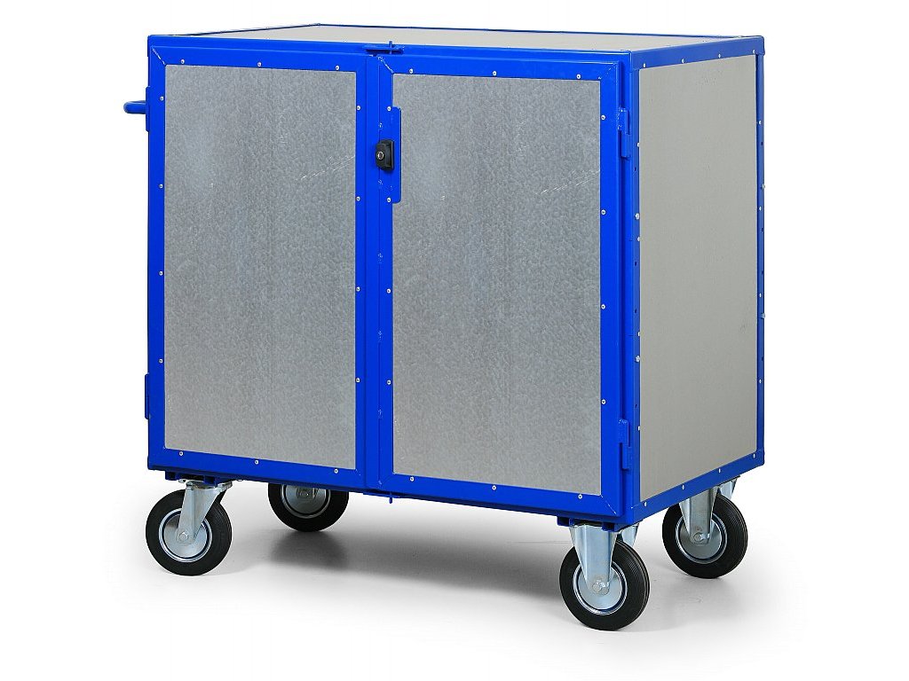 Dieser Wagen ist für Transport geignet. Bodenmass 1200 x 800 mm und einer Gesamthöhe von 1250 mm. Die Wände und der Deckel sind aus verzinkten Stahlblech 1 mm hergestellt. Pulverbeschichtet Farbe blau RAL 5005. Der Boden ist aus laminierte Spanplatte hergestellt. Boden sind um 10 cm verstellbar.