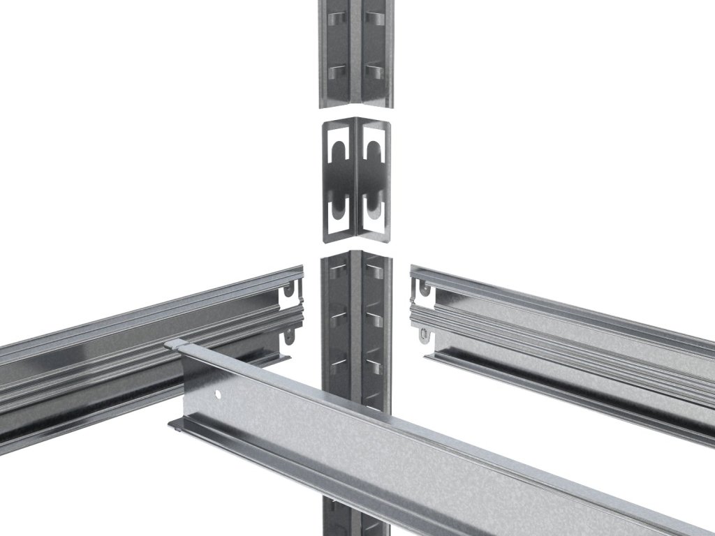 - Die Winkelprofile des Regals sind geteilt und werden mit Verbindern verbunden.