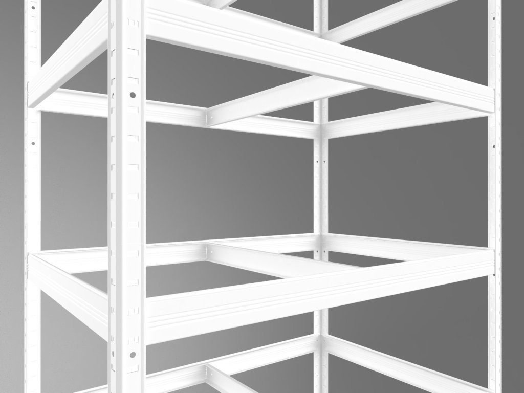 Steckregal mit Fachböden aus OSB-Spanplatten 10 mm. Regale mit OSB-Fachböden eignen sich auch für feuchte Räume wie Schuppen, Pergolen oder Keller. Sie sind jedoch nicht für den Außenbereich mit direkter Niederschlagseinwirkung geeignet. Das einzigartige schraubenlose Stecksystem ermöglicht eine schnelle Montage – die Bodenträger werden einfach in die Winkelprofile gesteckt und durch leichtes Klopfen fixiert. Diese schraubenlose Verbindung garantiert eine hohe Steifigkeit.