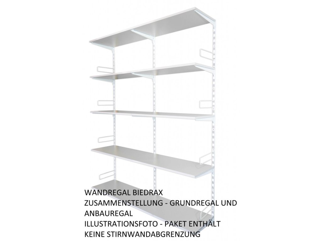 Das Anbauwandregal enthält in der Packung nur eine Lochschiene auf der Wand mit löchern in zwei Reihen. Wenn Sie eine Zusammenstellung von Regalen brauchen, wählen Sie einen Grundwandregal und dazu dann das Anbauregal oder Regalen.