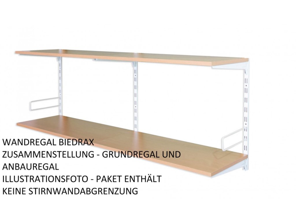 Das Anbauwandregal enthält in der Packung nur eine Lochschiene auf der Wand mit löchern in zwei Reihen. Wenn Sie eine Zusammenstellung von Regalen brauchen, wählen Sie einen Grundwandregal und dazu dann das Anbauregal oder Regalen.
