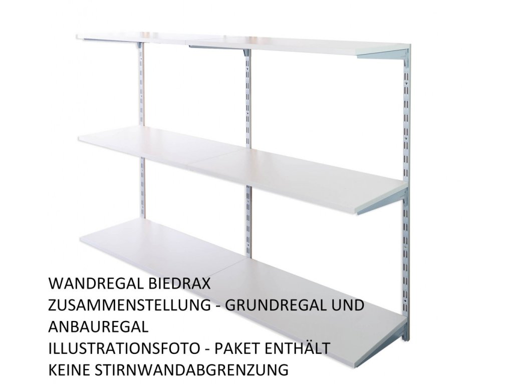 Das Anbauwandregal enthält in der Packung nur eine Lochschiene auf der Wand mit löchern in zwei Reihen. Wenn Sie eine Zusammenstellung von Regalen brauchen, wählen Sie einen Grundwandregal und dazu dann das Anbauregal oder Regalen.