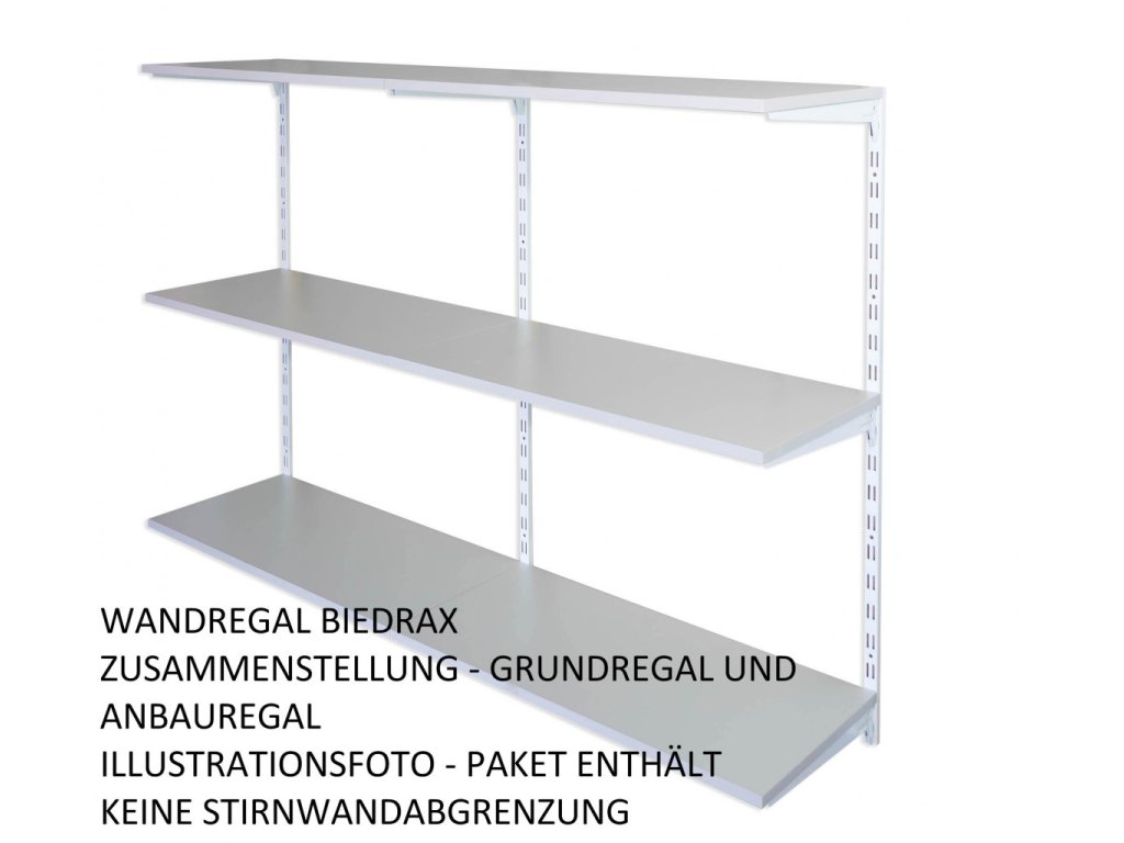Das Anbauwandregal enthält in der Packung nur eine Lochschiene auf der Wand mit löchern in zwei Reihen. Wenn Sie eine Zusammenstellung von Regalen brauchen, wählen Sie einen Grundwandregal und dazu dann das Anbauregal oder Regalen.