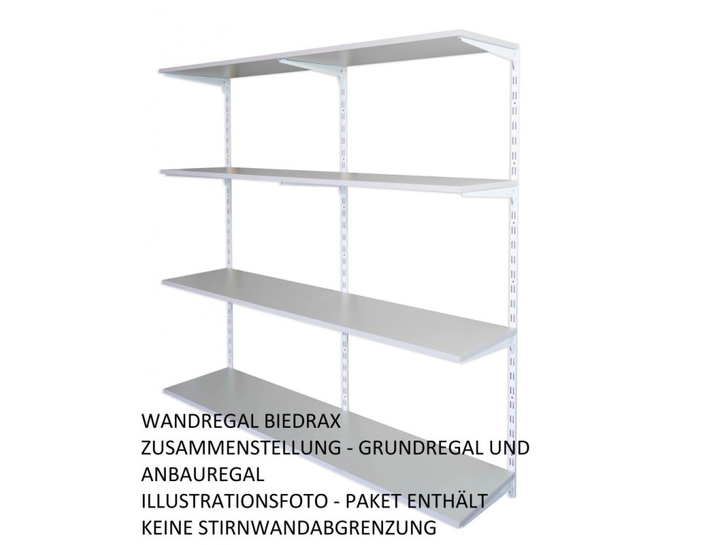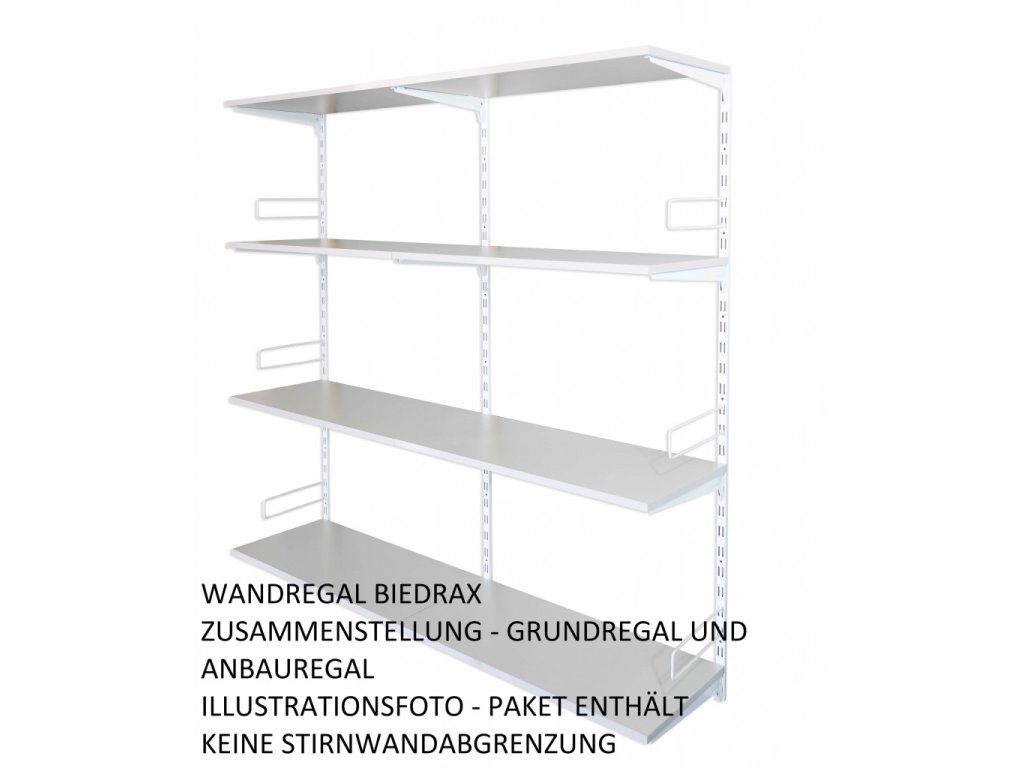 Das Anbauwandregal enthält in der Packung nur eine Lochschiene auf der Wand mit löchern in zwei Reihen. Wenn Sie eine Zusammenstellung von Regalen brauchen, wählen Sie einen Grundwandregal und dazu dann das Anbauregal oder Regalen.