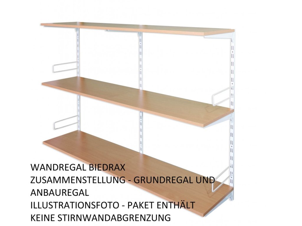 Das Anbauwandregal enthält in der Packung nur eine Lochschiene auf der Wand mit löchern in zwei Reihen. Wenn Sie eine Zusammenstellung von Regalen brauchen, wählen Sie einen Grundwandregal und dazu dann das Anbauregal oder Regalen.